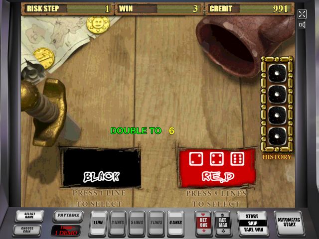 За каждую комбинацию вы получаете определенную выплату, но это еще не все. Каждому игроку предоставляется возможность увеличить награду в дополнительной риск игре, где пират предлагает сыграть в кости. Угадав цвет кубика (красный/черный), участник забирает удвоенную выплату и благополучно покидает каюту капитана.